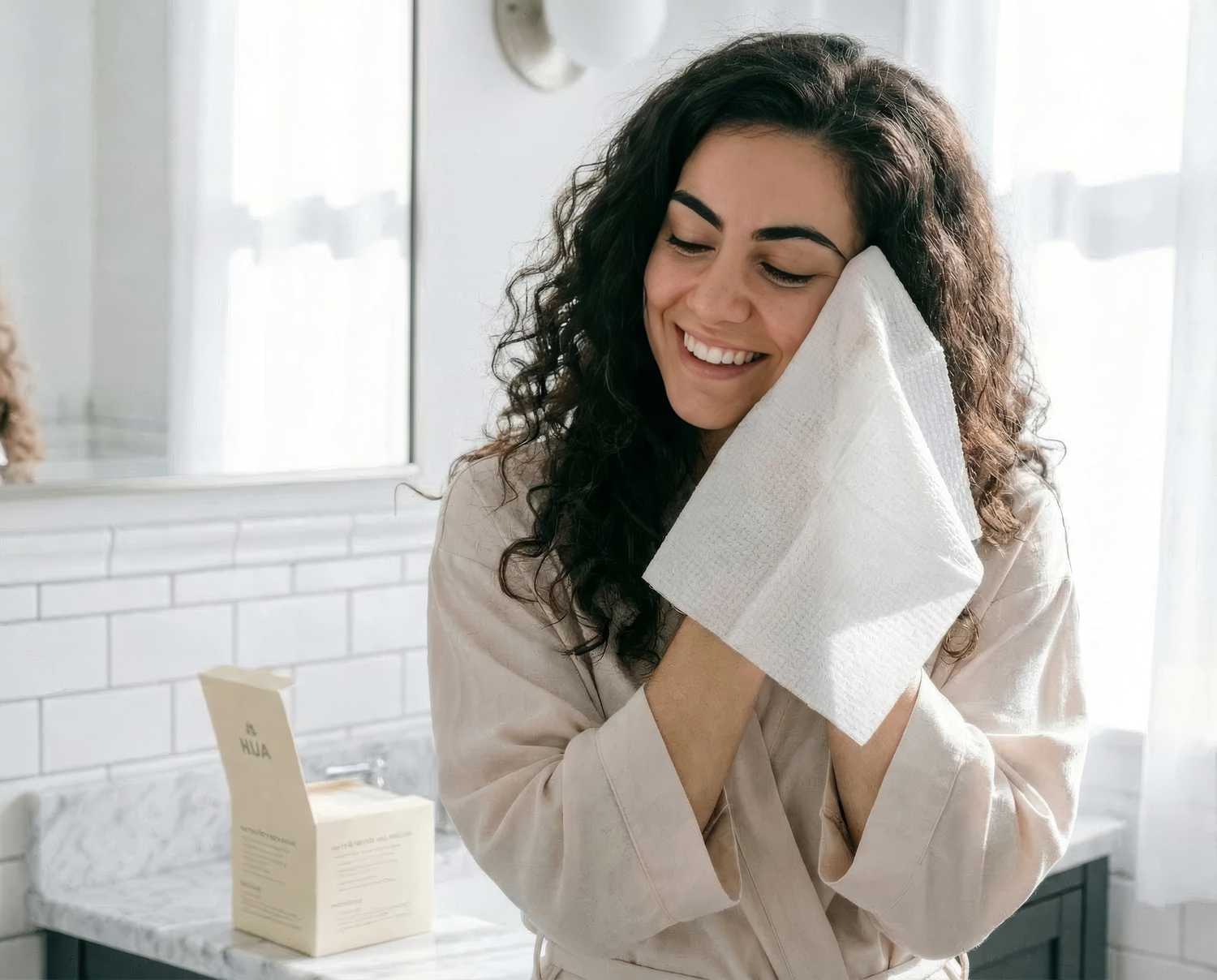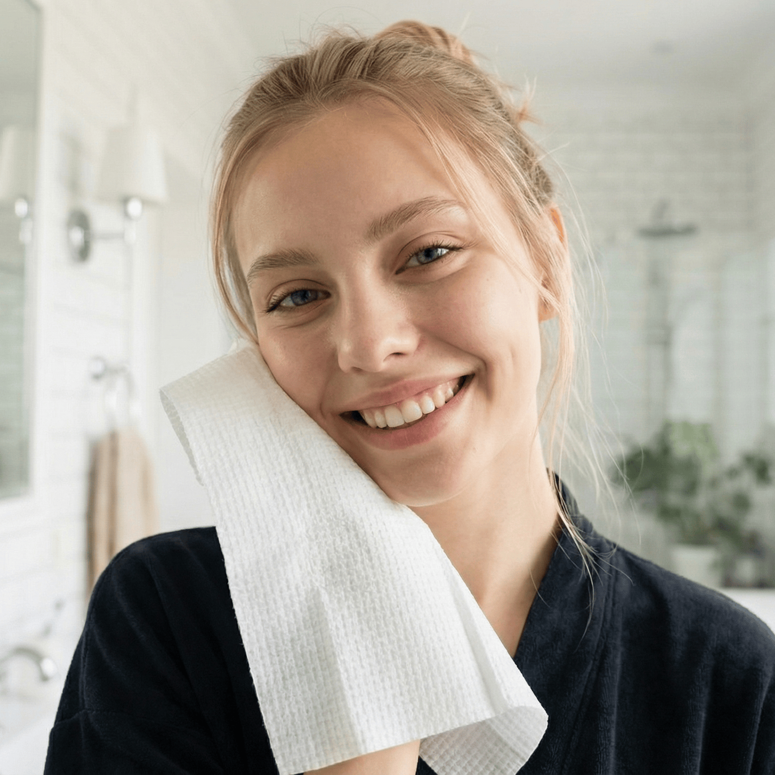 Меката текстура на Nua помага кожата да се усеща по-спокойна, чиста и по-здрава след измиване. Използването на нова, чиста кърпа всеки път предотвратява натрупването на бактерии от многократните хавлиени кърпи — една от най-честите причини за пъпки и зачервяване. А дерматологичните тестове и сертификатите за качество гарантират, че продуктът е напълно щадящ и подходящ за ежедневна грижа, дори при чувствителна кожа.