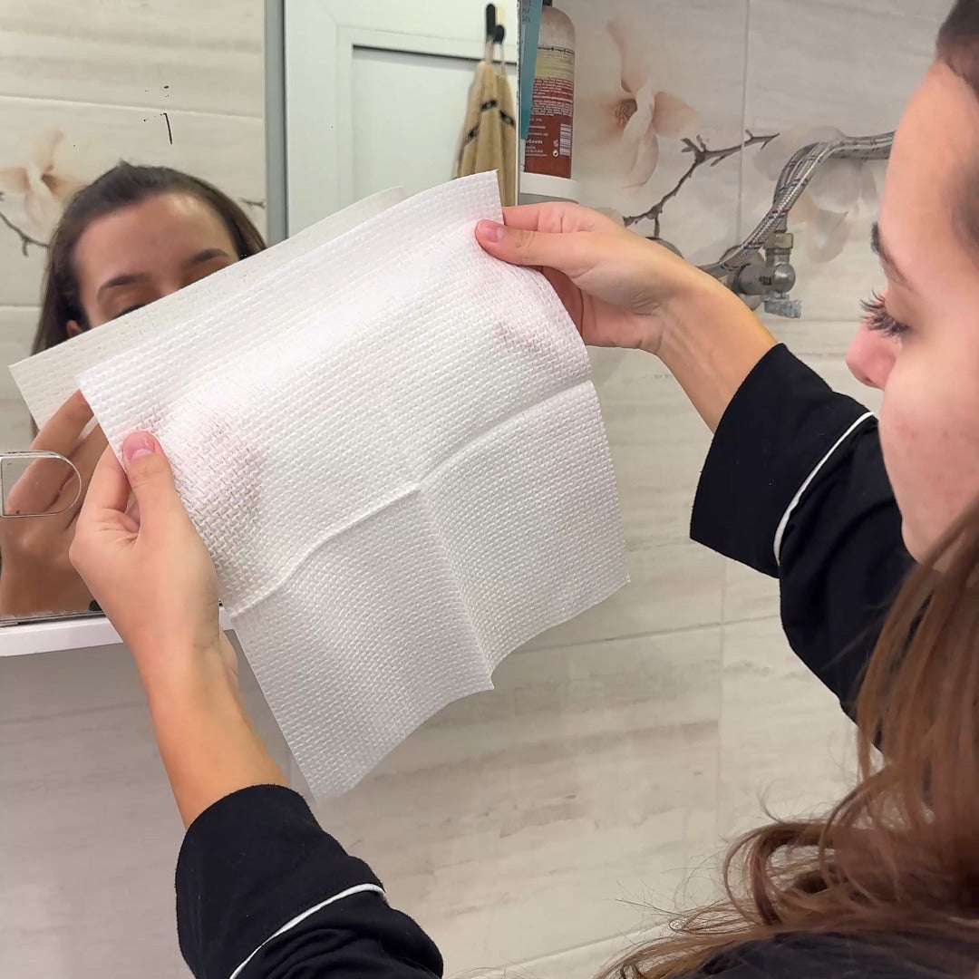 Всяка кърпа е 25 на 30 см – достатъчно за пълноценно почистване на лицето и шията с едно използване.